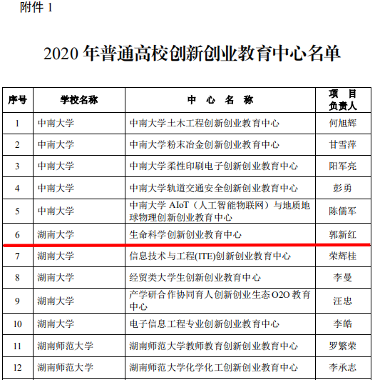 近日,湖南省教育厅公布2020年普通高校创新创业教育中心与校企合作创新创业教育基地认定结果,公司郭新红教授负责的《生命科学创新创业教育中心》名列其中。此次全省有106个创新创业教育中心,公司有5个创新创业教育中心。